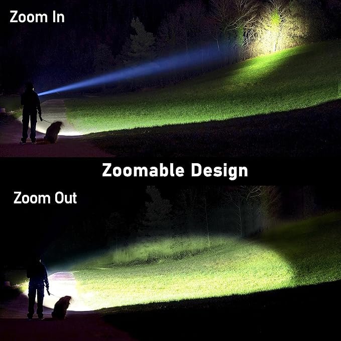 - 5 Lighting Modes & Zoomable: Choose from High, Medium, Low, Strobe, and SOS modes with a simple one-button control. The zoomable design lets you adjust the beam to focus on nearby objects or extend the range for distant viewing.