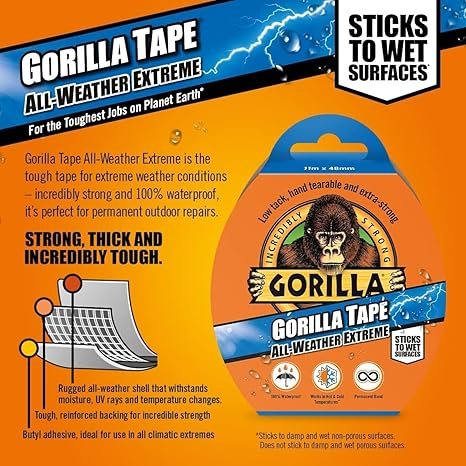 - UV-Resistant: Designed to withstand harsh weather conditions, Gorilla Tape resists UV rays, making it perfect for outdoor use without fading or losing adhesion.